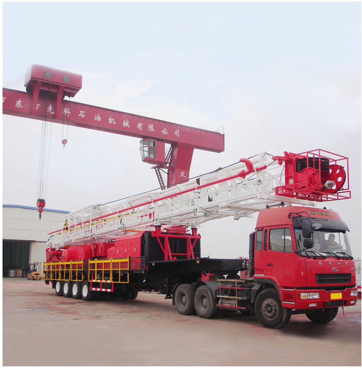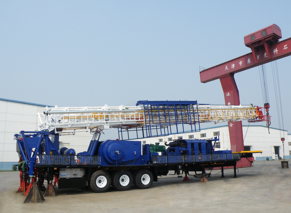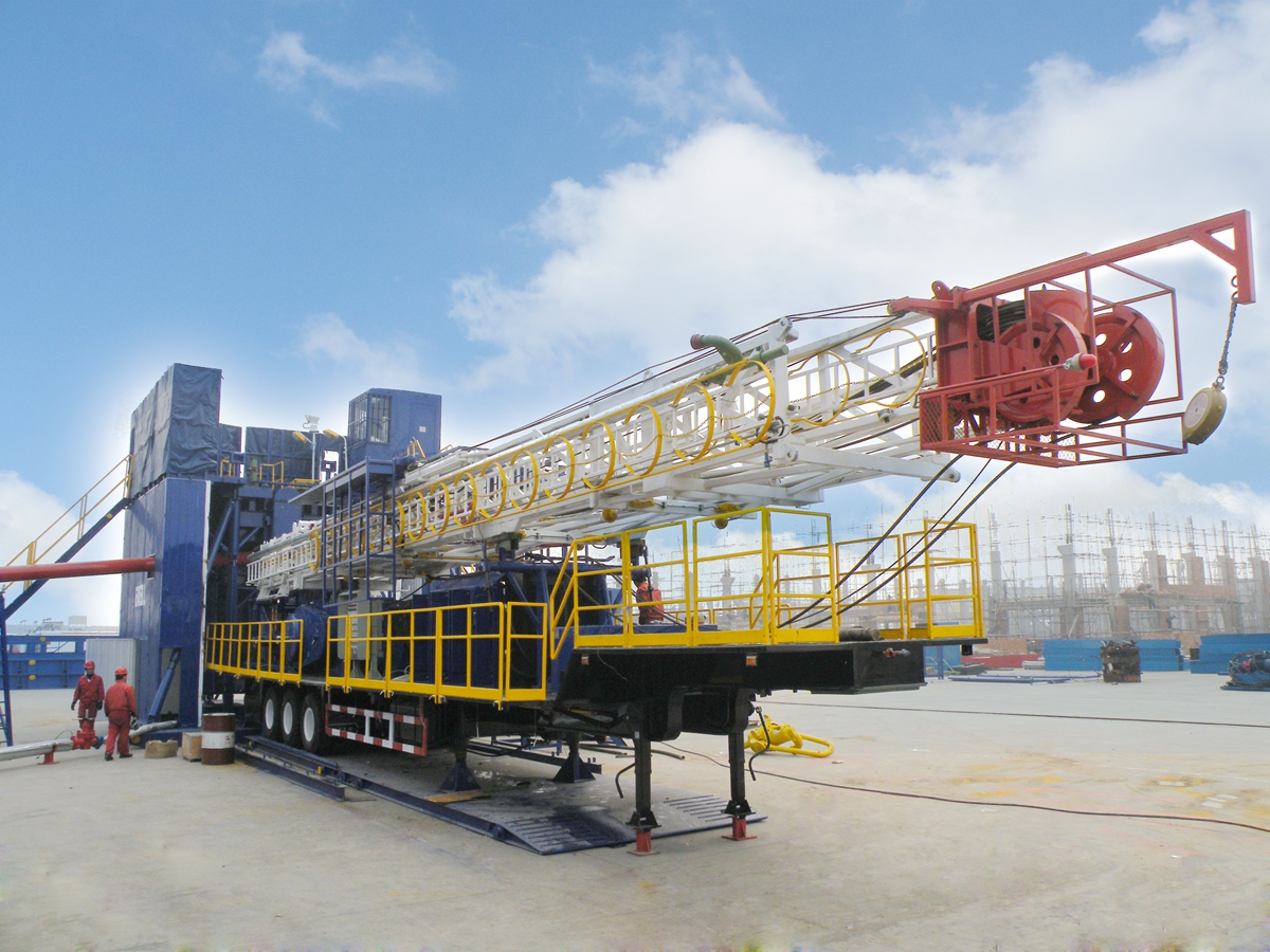 拖裝鉆機的動力、絞車、井架、游車系統(tǒng)及傳動機構(gòu)全部裝載于半掛底盤上,移運時用牽引車拖掛移運至現(xiàn)場,該類產(chǎn)品對于提高鉆井作業(yè)搬遷效率具有很大的優(yōu)勢,而且節(jié)約移運資源,適合油區(qū)道路條件較好、井場相對開闊的油田。我公司設(shè)計制造的1500米、2000米、3000米和4000米鉆深的柴油機驅(qū)動半掛鉆機車,其最大靜載荷從1350~2250kN,具有作業(yè)負荷大、性能可靠、越野能力強、搬遷方便、費用低等特點,適應(yīng)于中淺井鉆井作業(yè)。